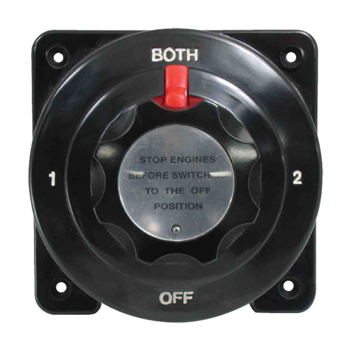 Battery selector switch with off/1/both/2 positions. Enables isolation of one battery or battery bank from the other, or link up both batteries in parallel for additional power. Engines must be shut down before turning to ‘off’ position. Rotary dial has a spring loaded keeper to positively lock the selected position. Designed to be surface mount with cable entry from below.