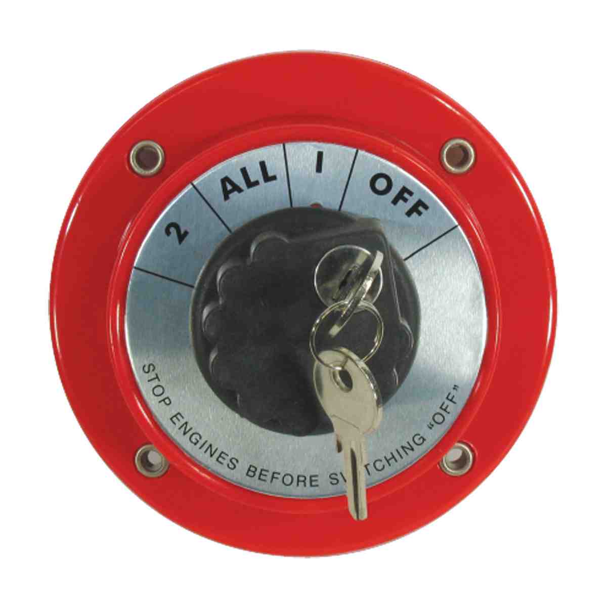 Battery selector switch with key lock providing added security to engine starting. Four position options enable isolation of one battery or battery bank from the other. Also provides the ability to link both batteries in parallel. The unit can be surface or partially recess mounted.
