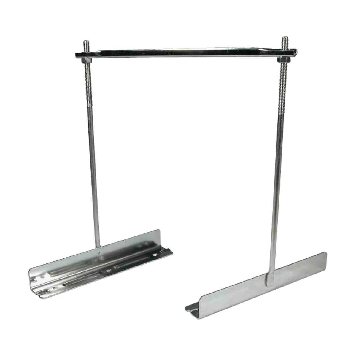 Stainless steel battery tie down set. Pressed stainless steel angled base mounts. 6mm diameter uprights with hex nuts and cross bar to secure battery.