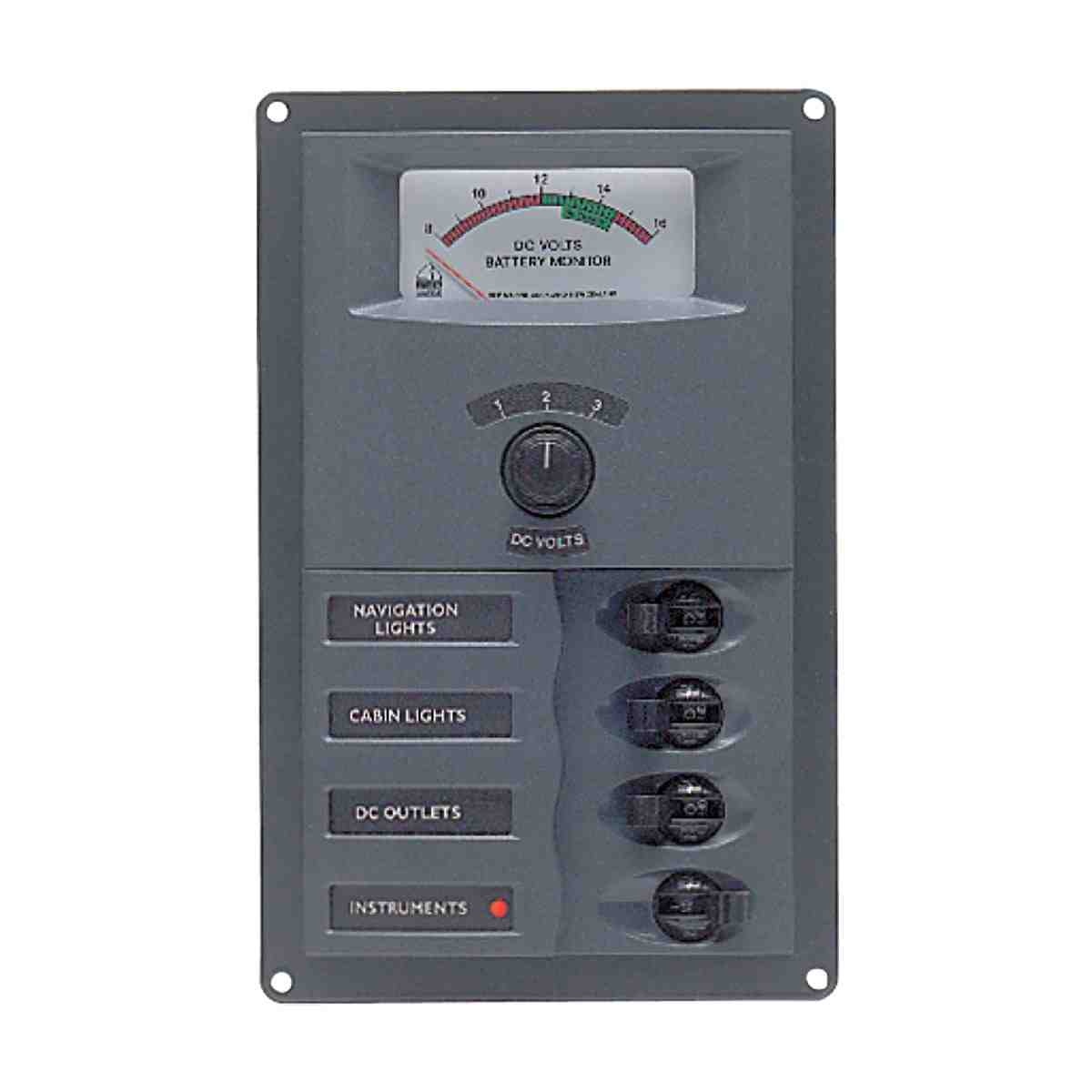 Circuit breaker panels with stylish curved front facia incorporating recesses for circuit breaker toggles preventing them from being switched on accidentally. Available with 12 volt (AV12) or 24 volt (AV24) analogue expanded scale meter with three way selector switch to monitor multiple battery banks. Larger panels include both voltmeter and ammeter. Analogue ammeters are supplied standard in 0-50 amp scale (AA50) and include a 50 amp shunt. An alternative 100 amp meter can be substituted with a corresponding 100 amp shunt. For secondary shunts refer page 211. For other label options refer pages 156 and 157. For replacement circuit breakers refer page 190.