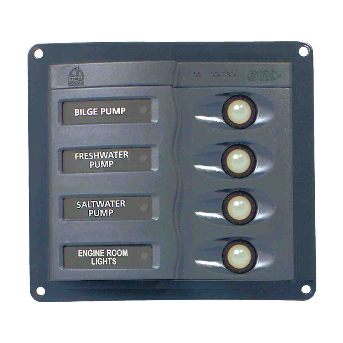 Available with four or eight 10mm red LEDs indicating important ‘systems in operation’ information (pumps, engine room, lights etc). Ideally suited for flybridge or remote dash position. Back lighting on labels. 113271 include alarm and mute switch. Four gang panel supplied with 113700 label set. Eight gang panel supplied with 113700 and 113704 label sets.