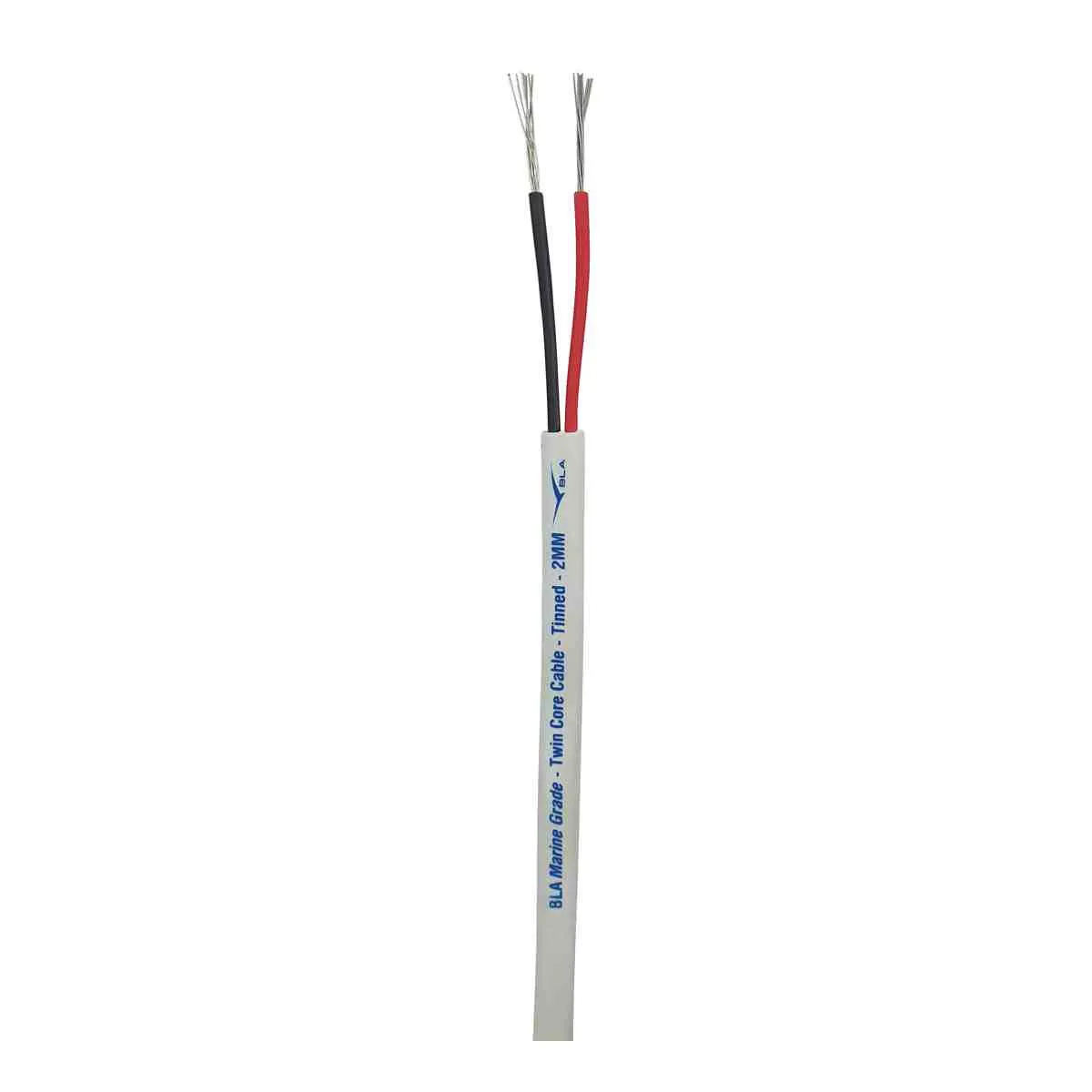 Marine quality, twin core low voltage wiring with external sheath for extra protection in vulnerable applications. V90 PVC insulation and sheath to AS/NZS 3808, tin coated copper wire conductor to AS/NZS 1125. Supplied in 50 and 100 metre metal centred coils. Red/black core with white outer sheath, printed with sizing and metre marks.