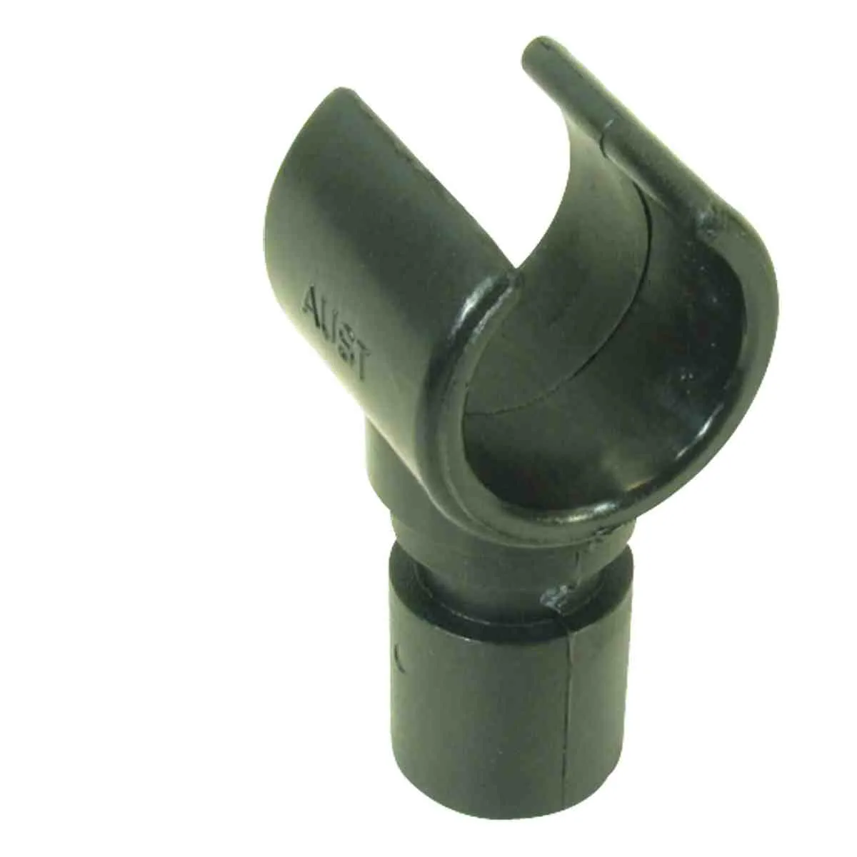One end snaps around a tube and the other end inserts into a tube. Moulded in black nylon.