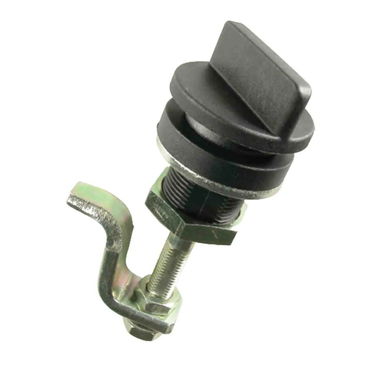 Large control knob utilises a quick action (75°) twist to lock/unlock. Die cast zinc alloy housing with black acetal knob and black nylon spacer to allow knob to stand off panel. Adjustable position grip depth (maximum 65mm). Zinc plated bolt and tongue.