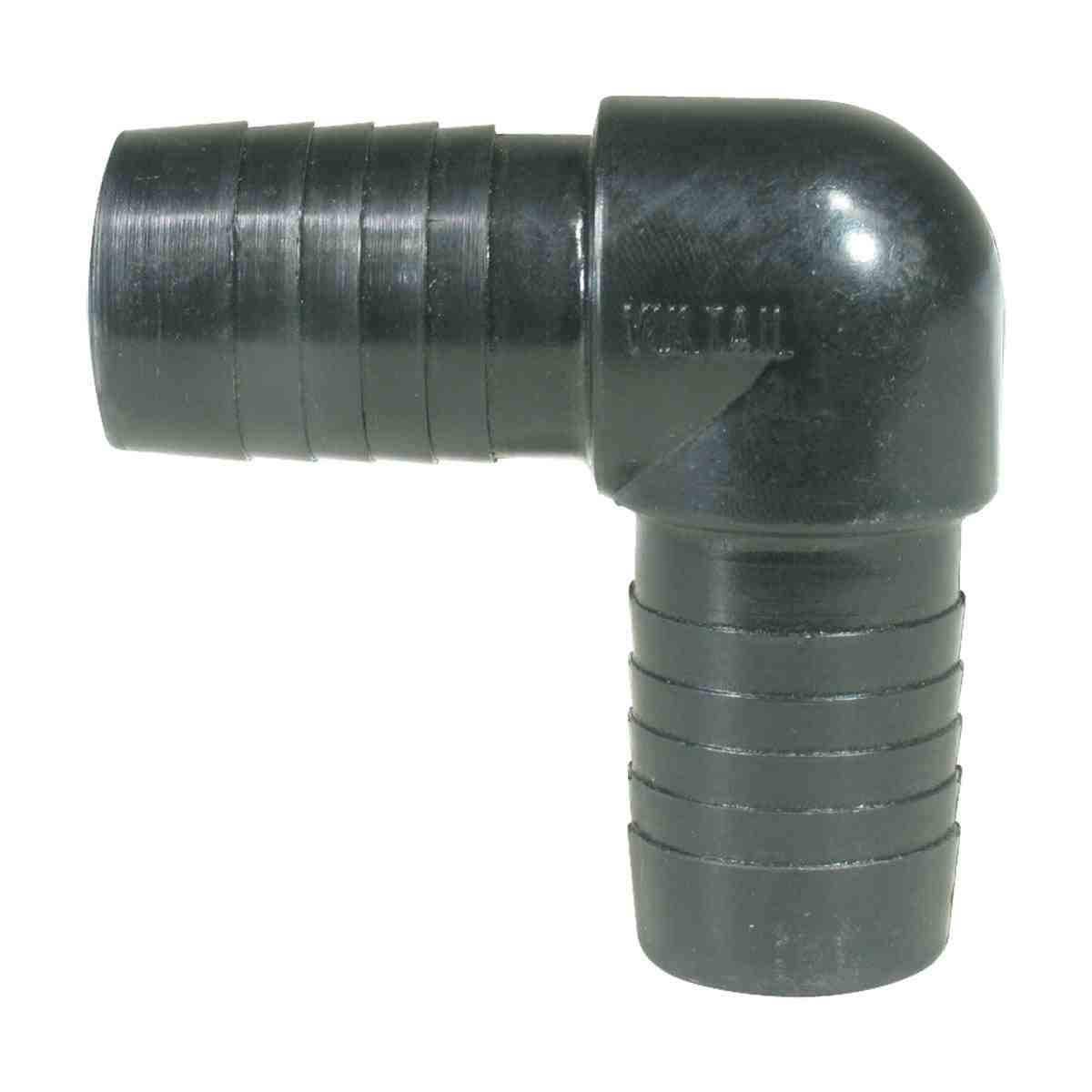 90° elbow joiner with a barbed hose fitting at each end. Made from polypropylene.