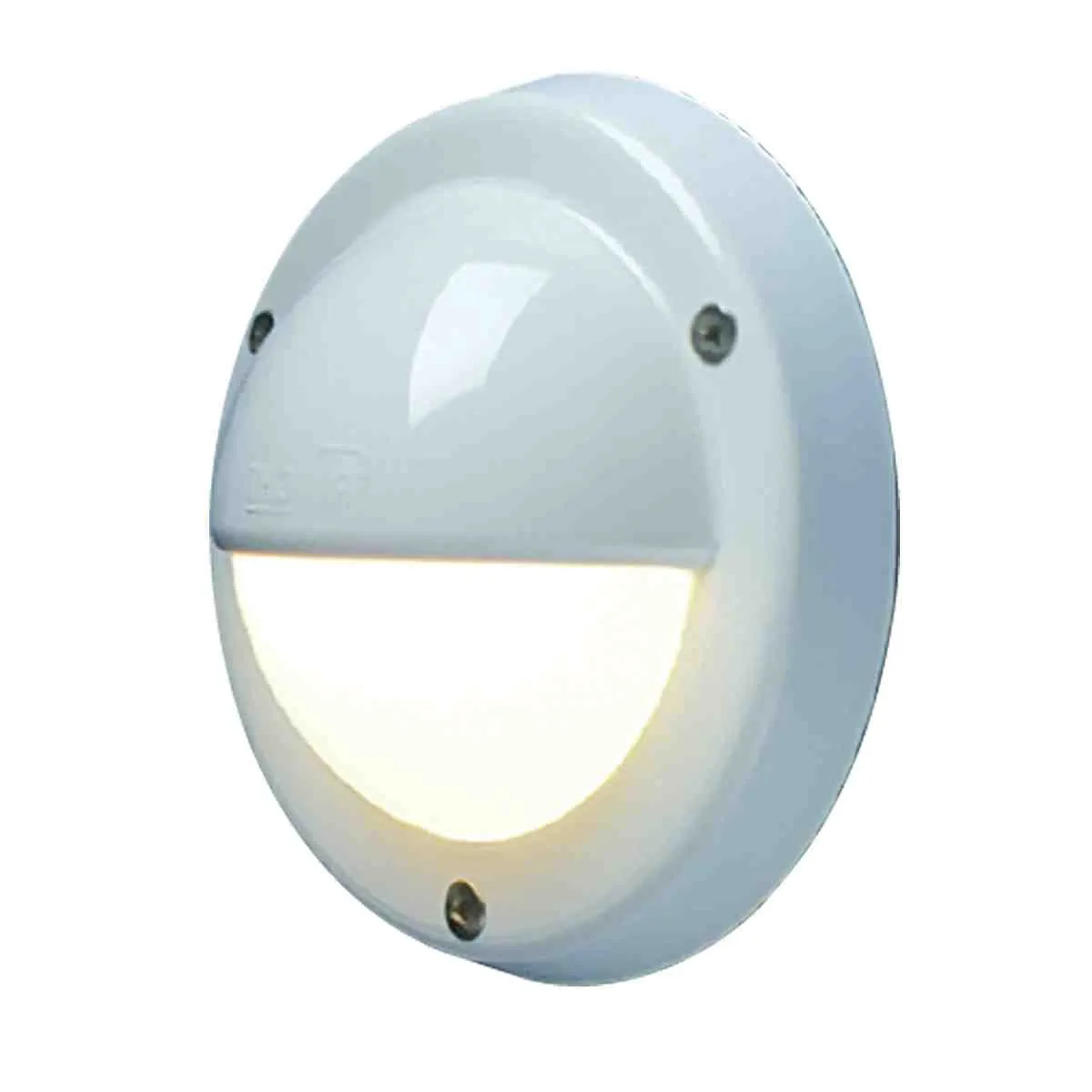 Versatile, interior/exterior semi recessed side mount light that can be hosed down. ‘O’ ring sealed plastic pearl lens. Gloss finish, moulded plastic cover housing.
