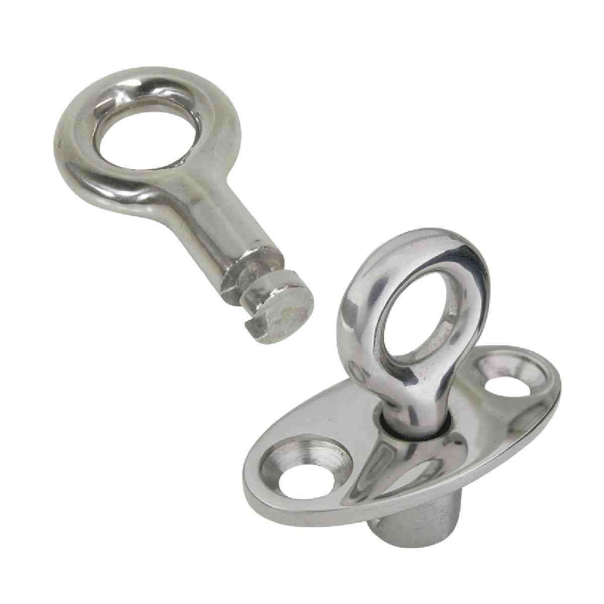 Provides a removable attachment point for canopy straps. Includes keyed removable ring and flush deck socket. To remove, turn ring sideways to base plate and lift out, eye remains locked in at any other position. All 316 grade stainless steel construction.