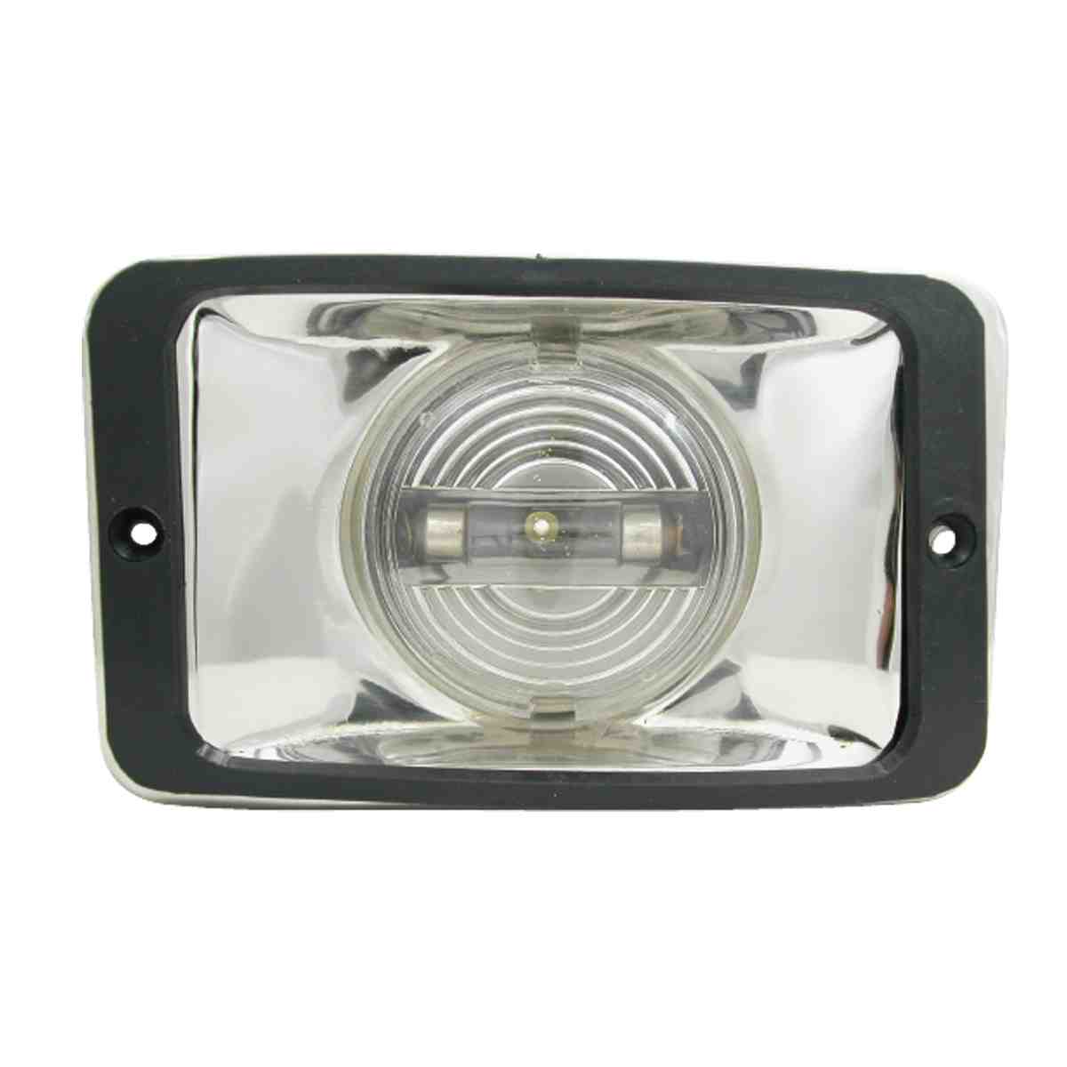 Flush mounting. Pressed stainless steel construction. Clear plastic lens. Supplied with mount gasket. 12 volt, 10 watt bulb.