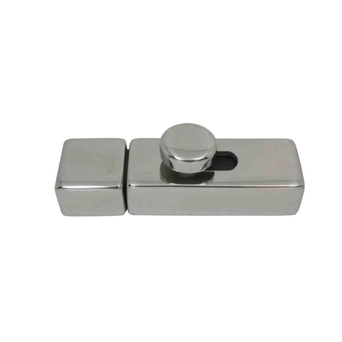 Spring self-closing, square line barrel bolt. Mirror polished cast 316 grade stainless steel body with concealed mount fastenings. Nylon slide for smooth action and no rattle.