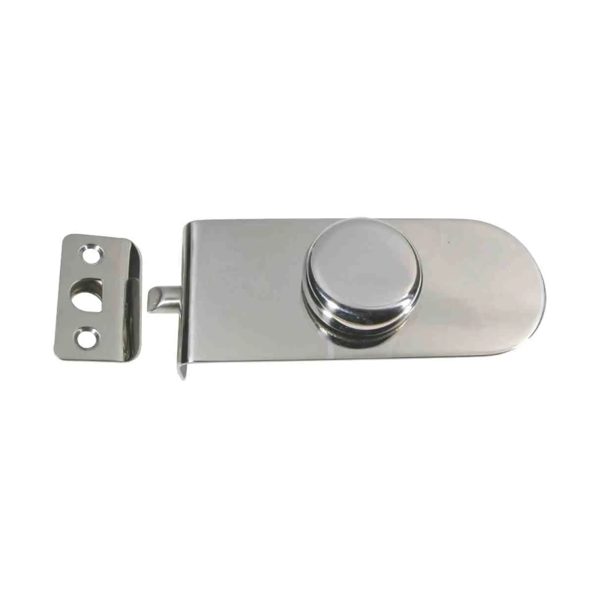 316 grade stainless steel face plates, bolts and knob with nylon back housing for smooth silent operation. This product features a spring loaded, adjustable stroke stainless steel bolt. The bolt is reversible for in or out opening. A versatile catch that satisfies many requirements for marine door installations. Modern attractive recessed design. Striker plate has rubber stop bumper.