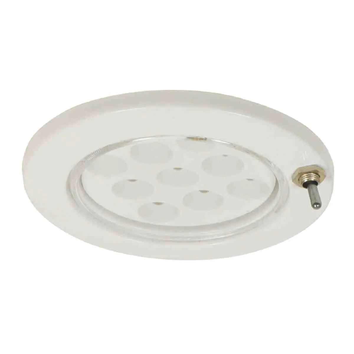 9 bright white 12 volt LEDs recessed into a compact low profile white plastic body. Mini toggle switch is mounted on the body for easy operation. Integral spring clip secures semi recessed light in position while clear cover lens helps protect LEDs.