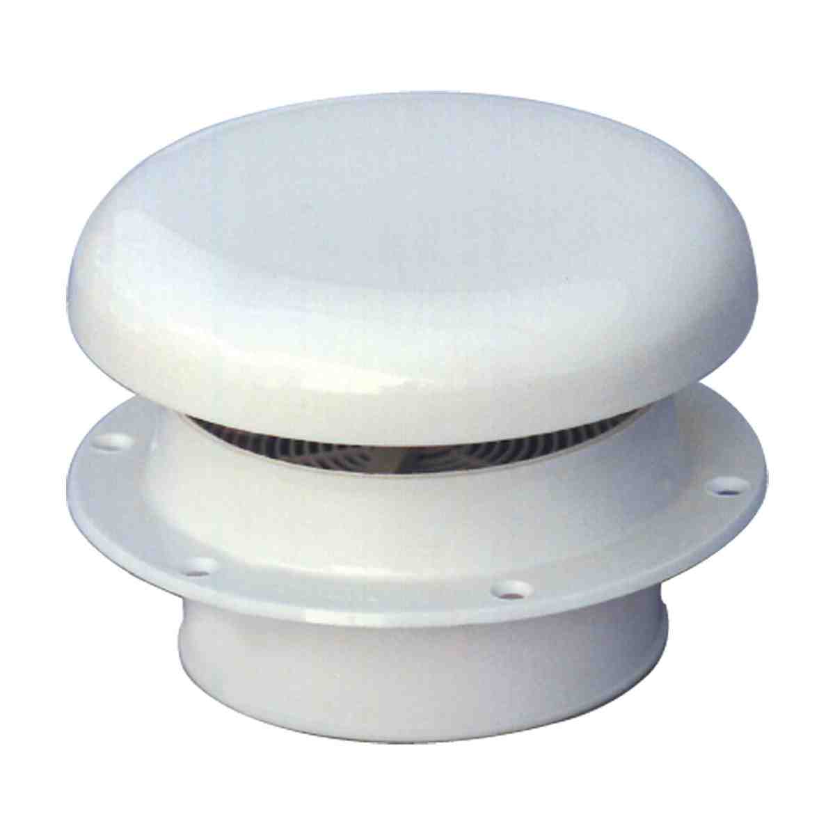 White moulded plastic, screw action ventilator with brass spindle. Plastic insect screen incorporated in base.