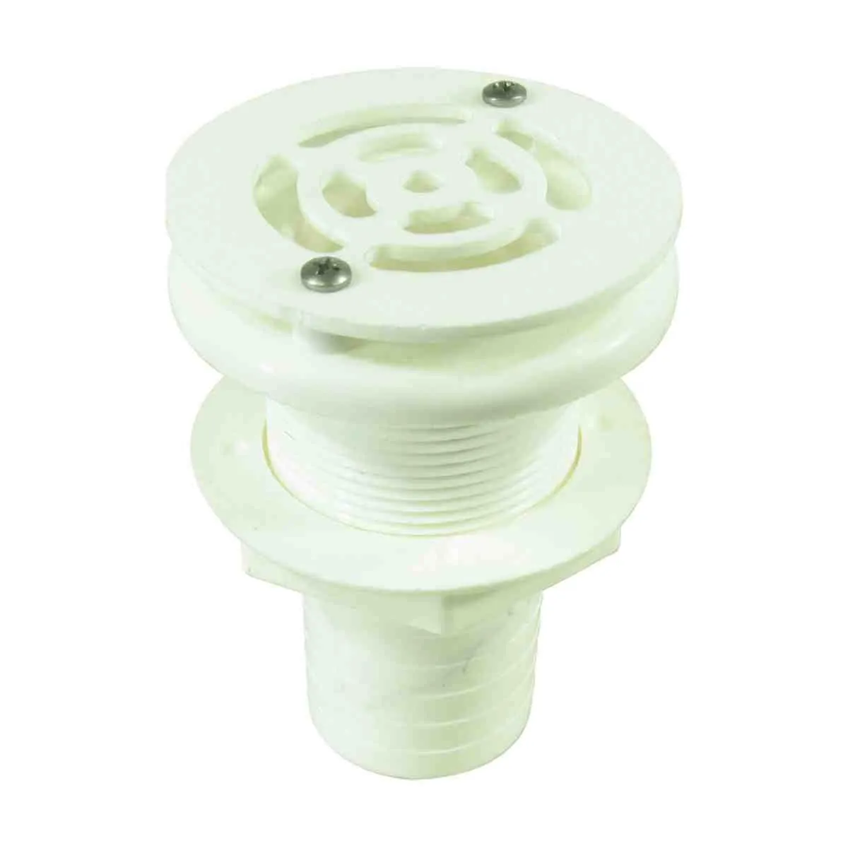 These overflow drains for baitwells incorporate a strainer that stands off the flange 6mm to prevent live bait going out the overflow or clogging the drain. White U.V. stabilised injection moulded plastic with stainless steel screws.