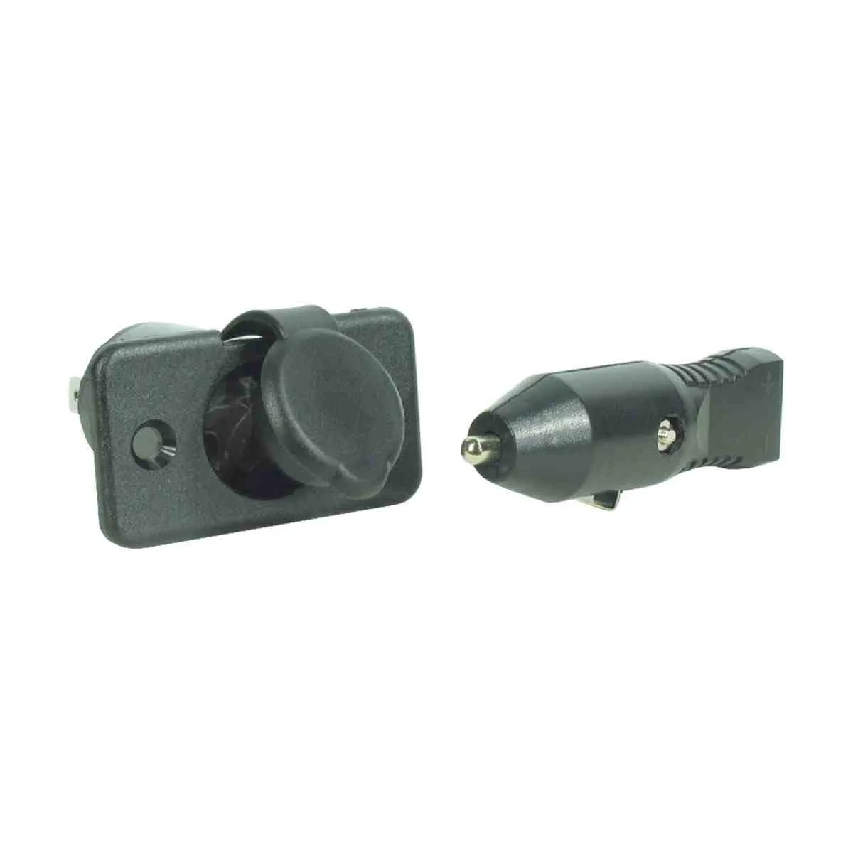 Rectangular cigarette lighter style, injection moulded black nylon, with secured plastic cover. Supplied as a set, socket and plug. 10 amps maximum.