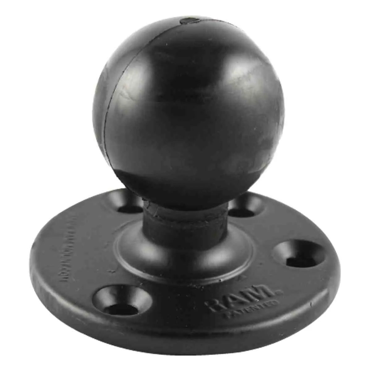 The RAM-D-202U consists of a 2.25″ diameter rubber ball, connected at right angles to a 3.68″ diameter round base. The base has pre-drilled holes, including two holes at 180 degrees and three holes at 120 degrees. RAM base 93mm.