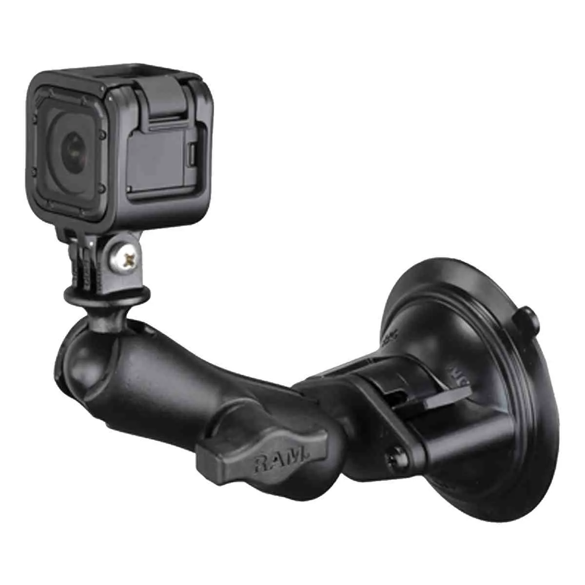 The RAM-B-166-GOP1 consists of a 83mm diameter suction cup twist lock base, STANDARD length double socket arm and 1″ diameter ball with custom GoPro® Hero adapter. The mount is designed with a RAM 1″ diameter patented rubber ball and socket system that has adjustment points at both ends of the double socket arm; this allowing for almost infinite adjustment and perfect viewing angles. The suction cup, twist lock base is designed to have a strong hold on glass and non-porous plastic surfaces, including adhesive disks. The GoPro® Hero adapter attaches directly to the under-side of the camera, replacing the factory mounting bracket.
