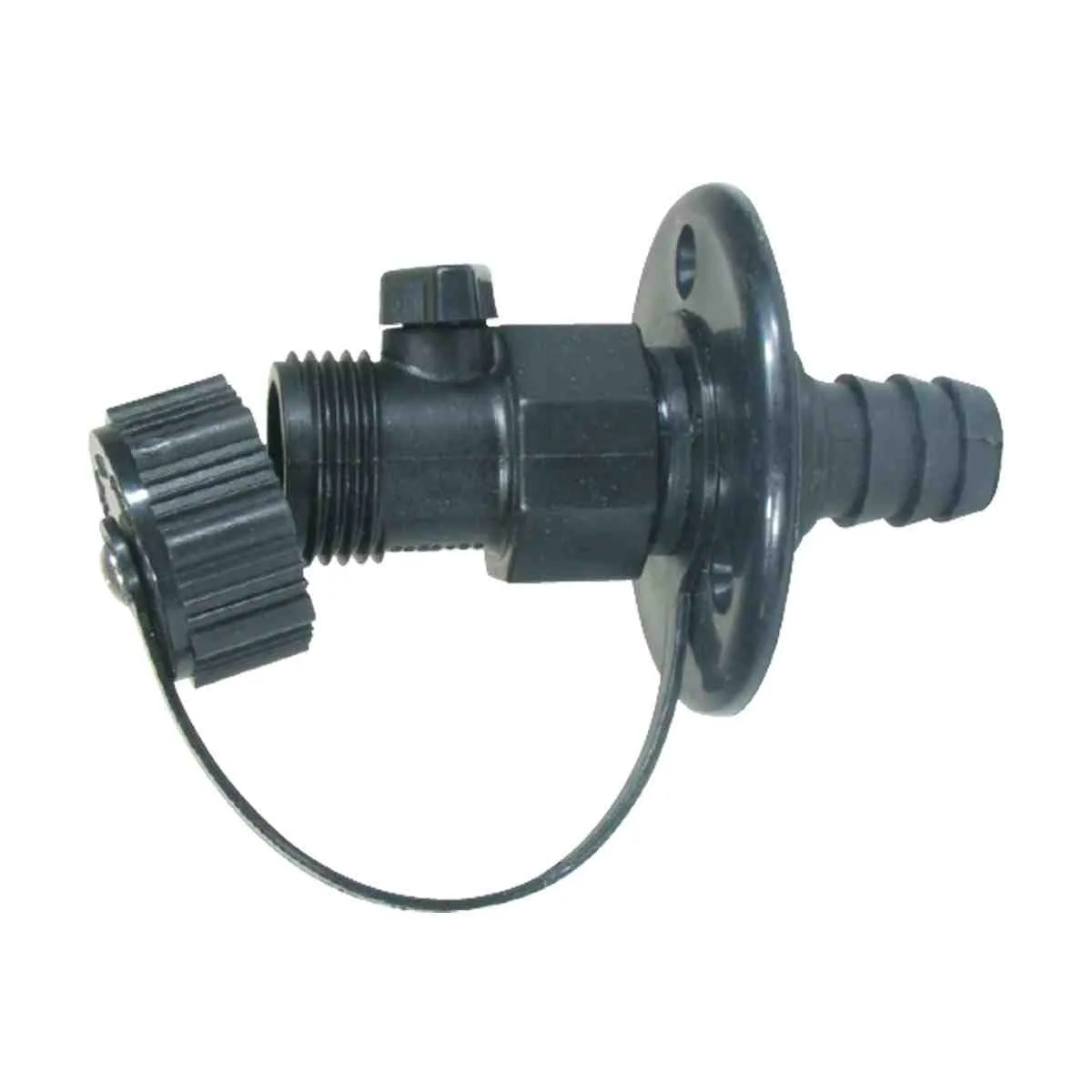 Black polypropylene fitting designed for installation through deck or bulkhead. 19mm hose tail on inside of the flange fitting and a 3/4″ NPT U.S.A. external thread on the outside. External access adjustable flow valve and sealing cap.